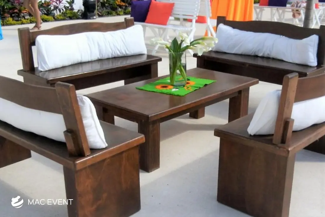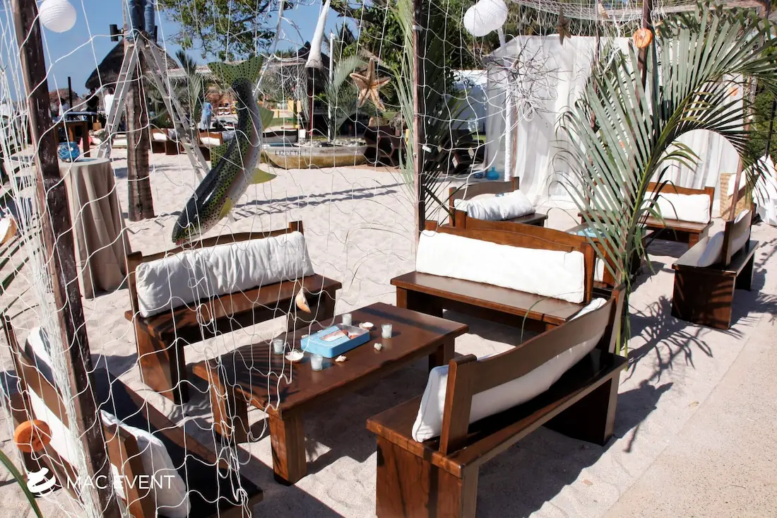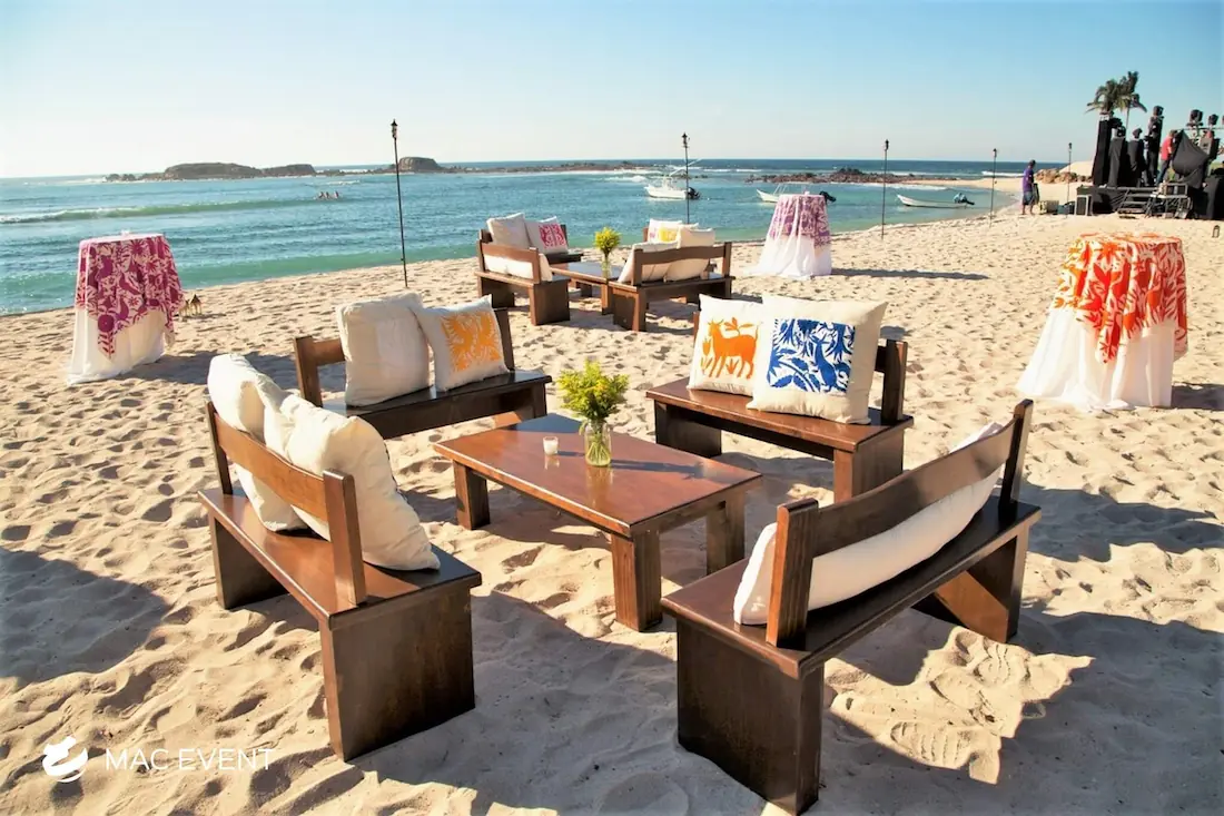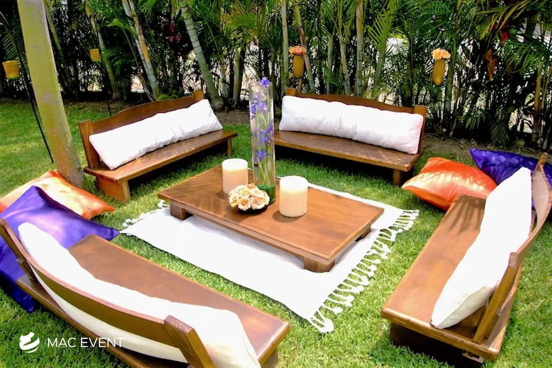 The rustic lounge adds warmth and natural beauty to weddings, beach parties, and corporate events in Nuevo Nayarit. With its wooden textures, earthy tones, and cozy design, this event lounge rental creates a relaxed yet elegant atmosphere that complements tropical, boho, or countryside themes. Ideal for outdoor receptions and social areas, the rustic lounge invites guests to unwind and connect in comfort. Renting rustic lounges in Nuevo Nayarit allows you to design charming and cohesive spaces that feel authentic and stylish. For a welcoming setup that blends nature and sophistication, the rustic lounge is an excellent choice.