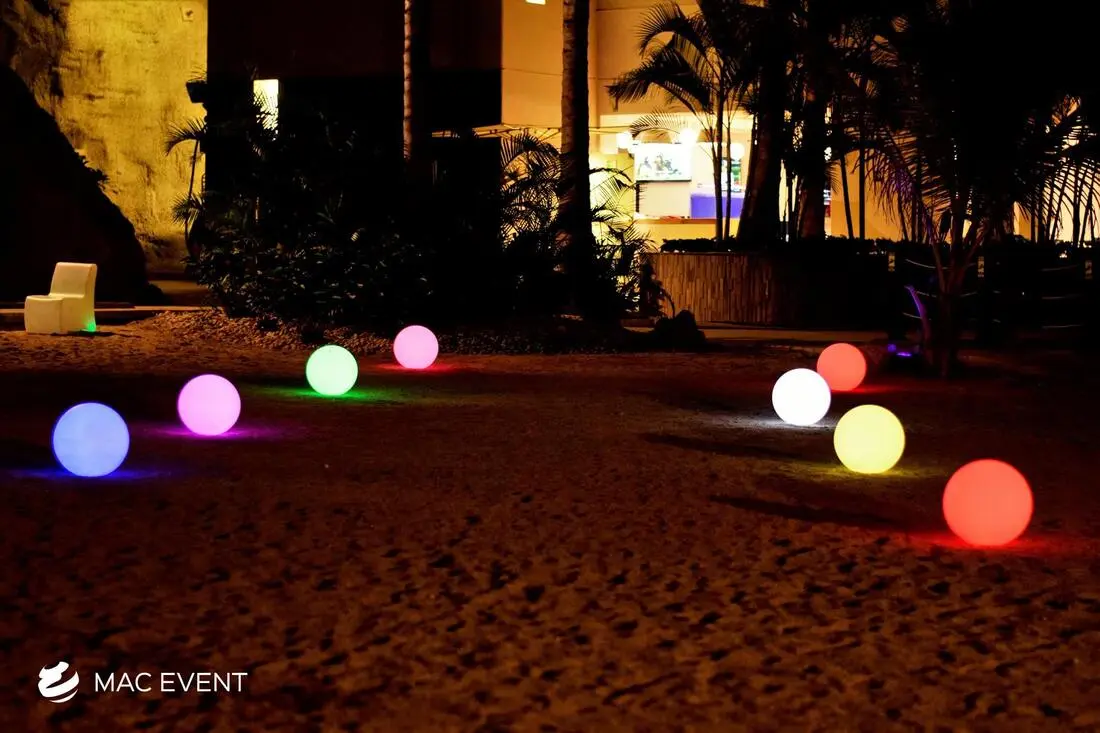The orb lights add a modern and enchanting touch to weddings, parties, and corporate events in Nuevo Nayarit. With their spherical glow and elegant design, this event lighting rental creates a captivating atmosphere that enhances both indoor and outdoor spaces. Perfect for hanging above dining areas, floating in pools, or accenting garden setups, orb lights bring sophistication and creativity to your décor. Renting orb lights in Nuevo Nayarit ensures professional installation, high-quality lighting, and seamless integration with your event theme. For a stylish and magical ambiance that impresses guests, the orb lights are a perfect choice.